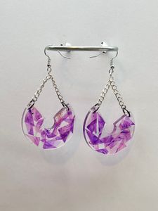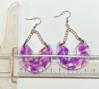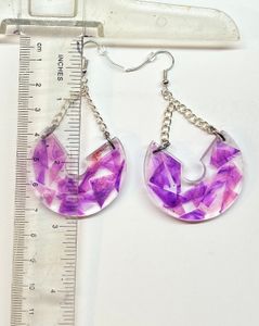 Handmade resin earrings with silver-colored chains and nickel-free hook earring. Purple pink and clear resin. Each earring is about 1 1/2 inches wide, and will hang about 2 3/4 inches when wearing.